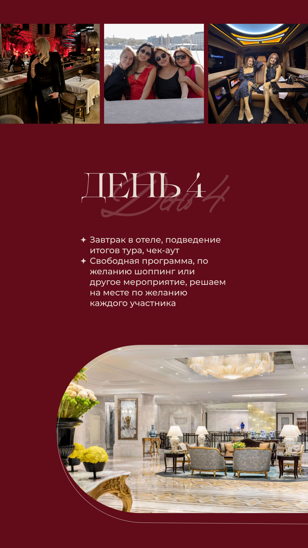Условия предоплаты: Первый платеж - $500, чтобы зафиксировать стоимость до повышения (при отказе от участия предоплата не возвращается). После предоплаты, можно оплатить тур двумя платежами по $1150, первый через 2 недели после внесения предоплаты, второй через 3 недели после внесения предоплаты
